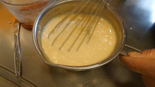 この時期に、両親の結婚記念日が来ます。 そこで… 厨房に立ちます! 「僕が?お菓子を作ります♪」 材料は、牛乳、卵、グラニュー糖! Google先生は、これだけで、出来上がりを当てましたよ。 卵を、溶きます。 「もう1個入れてもよかった」と、巨匠。 混ぜ方…