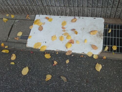 自宅も、杏が黄葉してます。 落葉! 実は、この白い板、落ち葉が落ちすぎて、側溝が詰まらないように、敢えて蓋をしてあるんですよ。 黄色混じりで、黄緑の杏です。 割と太めの葉なんですね。 写真から植物を判定するには、花を見がちですが、実は葉っぱの方…