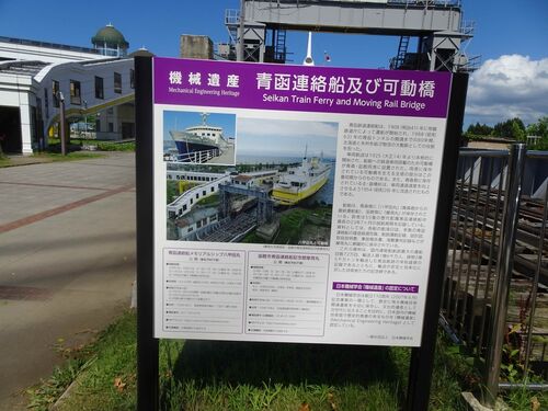 紫の看板に書かれているのは、可動橋。 青森駅の北、岸壁にあります。 これが、可動橋。 連絡船と接続して、車両を積み込むための設備です。 「機械遺産」の指定を受けていますね。 この上を貨車が通って、機関車に押し込まれて、船に積み込まれたそうです。…