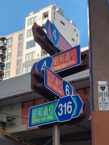 東京都中央区本町3丁目にある交差点です。 赤3つに緑1つなので、赤で! 赤は国道、緑は主要地方道。 主要地方道は、幹線を担う重要な都道府県道で、政令指定都市の一部市道も含まれます。 あんまり見たことないけど、一般県道の黄色(橙かな?)もあるそうで…
